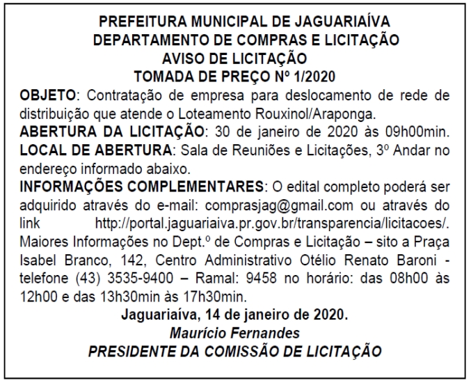Aviso de Licitação Tomada de Preço Nº 1/2020