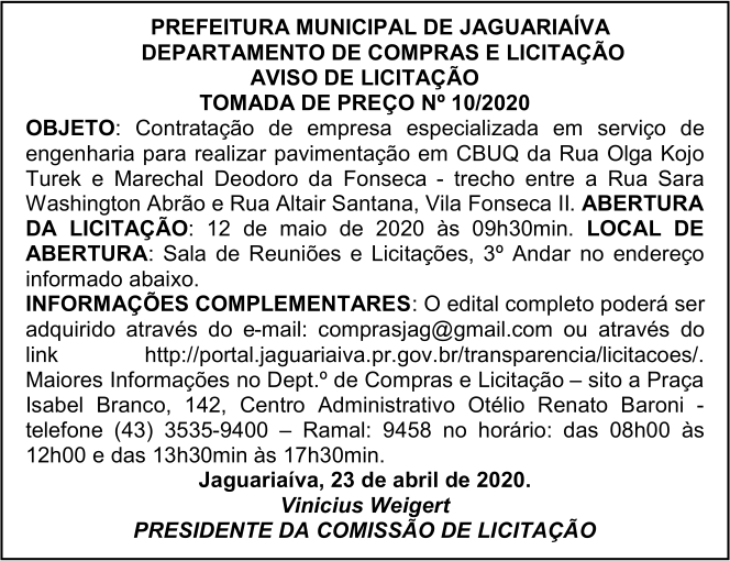 Aviso de Licitação Tomada de Preço Nº 10/2020
