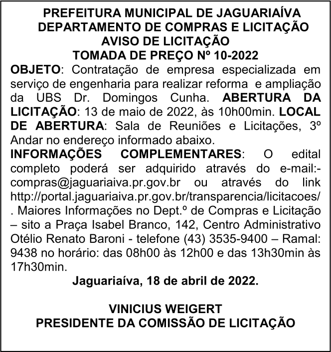 Aviso de Licitação Tomada de Preço Nº 10/2022