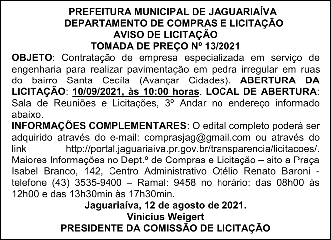 Aviso de Licitação Tomada de Preço Nº 13/2021