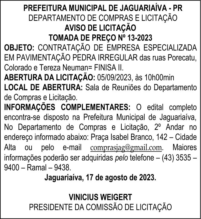 Aviso de Licitação Tomada de Preço Nº 13/2023