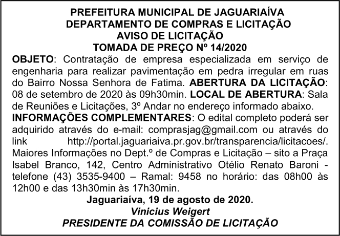 Aviso de Licitação Tomada de Preço Nº 14/2020