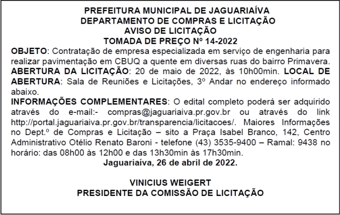 Aviso de Licitação Tomada de Preço Nº 14/2022