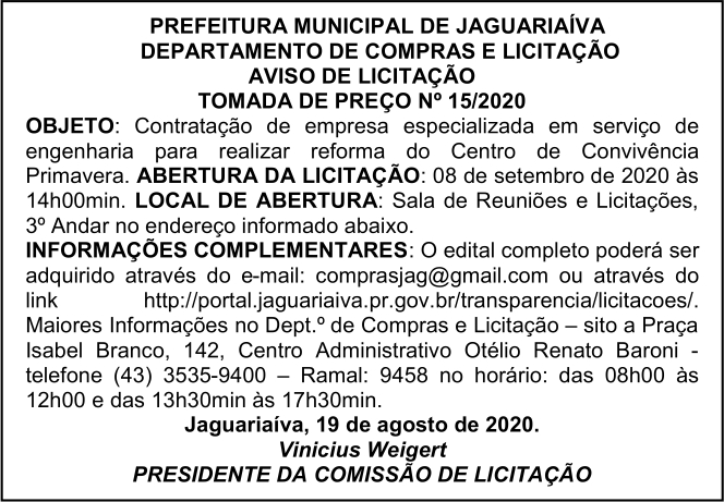 Aviso de Licitação Tomada de Preço Nº 15/2020