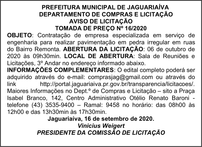 Aviso de Licitação Tomada de Preço Nº 16/2020