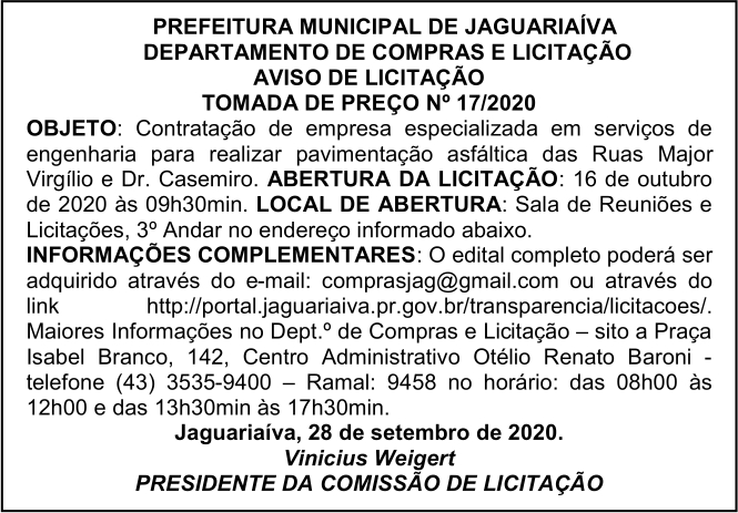 Aviso de Licitação Tomada de Preço Nº 17/2020