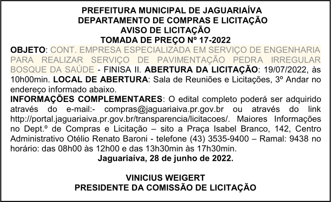 Aviso de Licitação Tomada de Preço Nº 17/2022