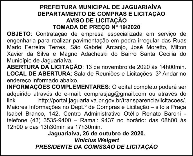 Aviso de Licitação Tomada de Preço Nº 19/2020
