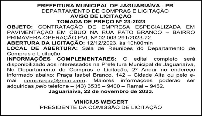 Aviso de Licitação Tomada de Preço Nº23 – 2023