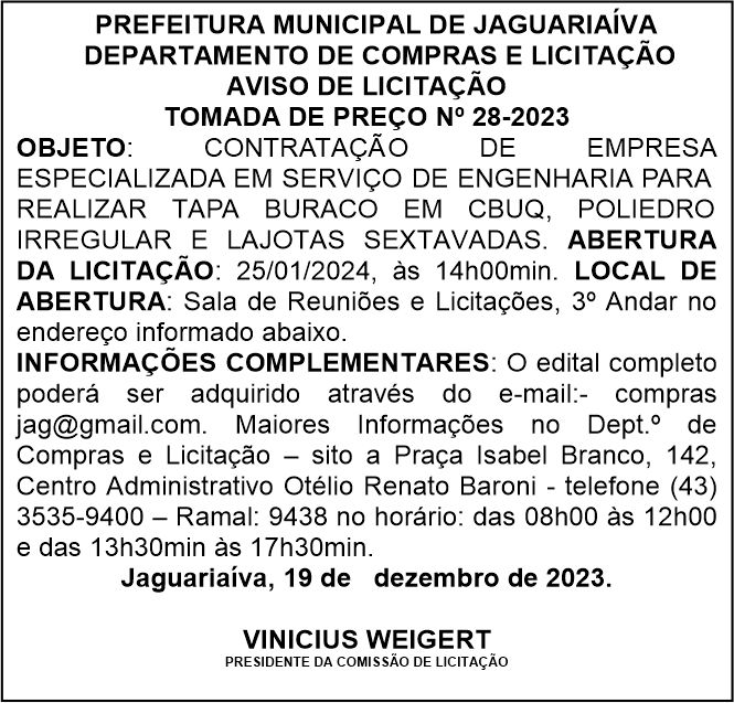 Aviso de Licitação Tomada de Preço Nº 28/2023