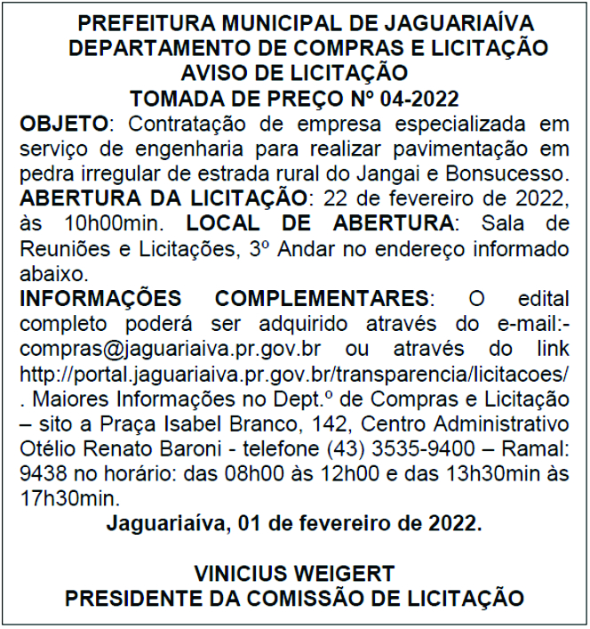 Aviso de Licitação Tomada de Preço Nº 4/2022