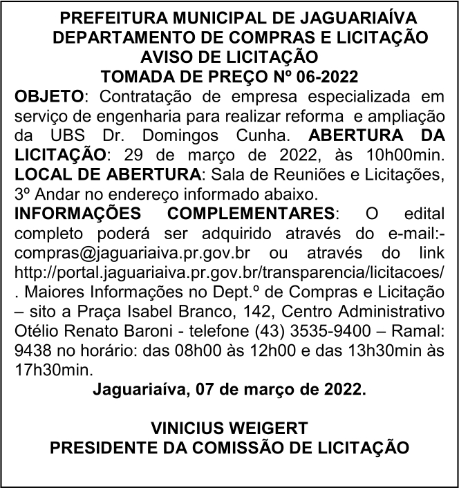Aviso de Licitação Tomada de Preço Nº 6/2022