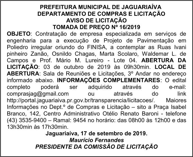 Aviso de Licitação Tomada de Preços Nº 16/2019