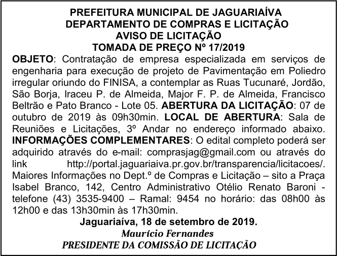 Aviso de Licitação Tomada de Preços Nº 17/2019