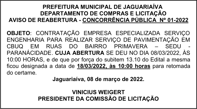 Aviso de Reabertura de Licitação Concorrência Pública Nº 01/2022