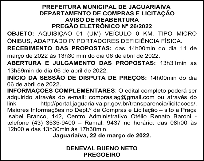 Aviso de Reabertura de Licitação Pregão Eletrônico Nº 26/2022