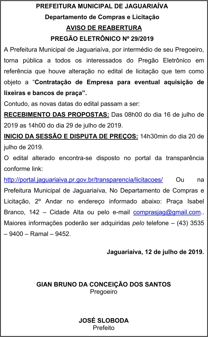 Aviso de Reabertura de Licitação Pregão Eletrônico Nº 29/2019