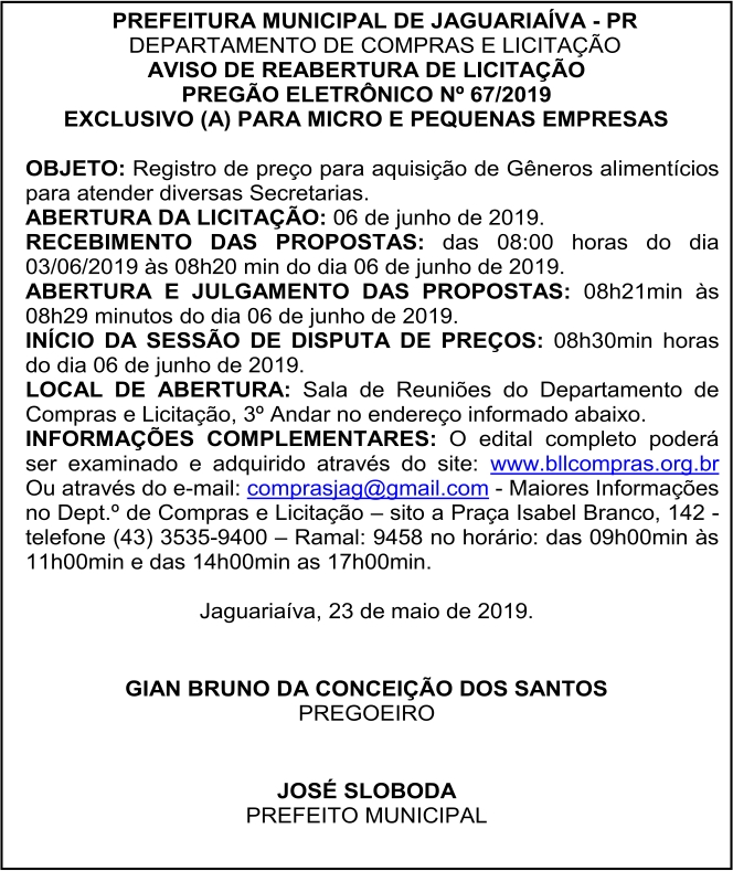 Aviso de Reabertura de Licitação Pregão Eletrônico Nº 67/2019