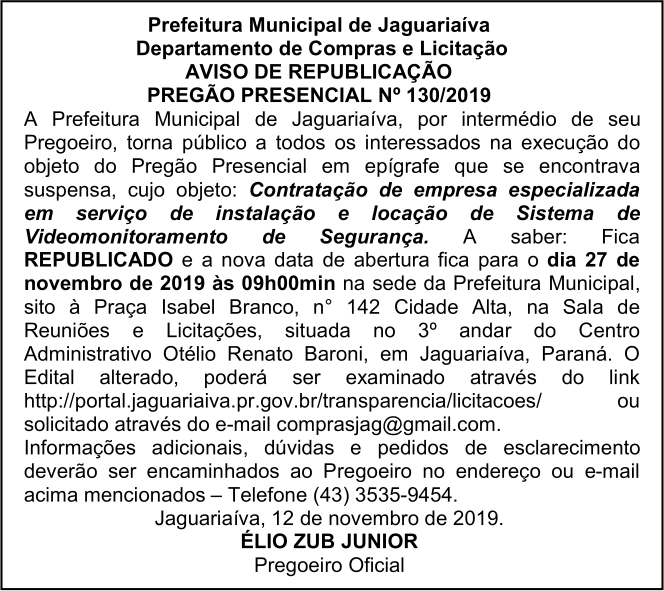 Aviso de Republicação Pregão Presencial Nº 130/2019