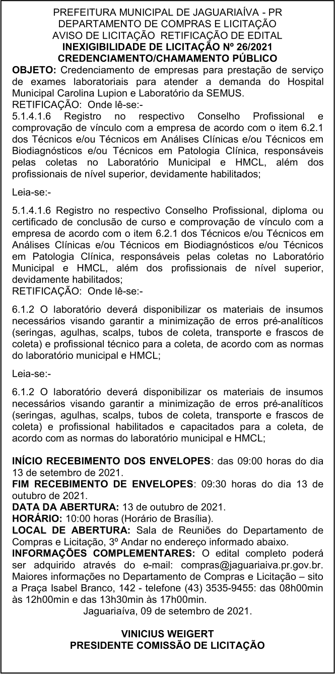 Aviso de Retificação de Edital Inexigibilidade de Licitação Nº 26/2021 – Credenciamento