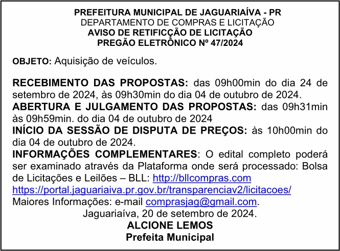 Aviso de Retificação de Licitação Pregão Eletrônico Nº 47/2024