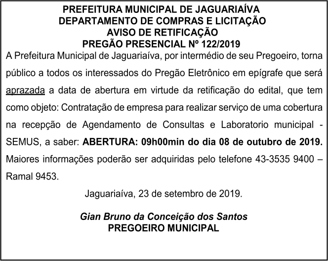 Aviso de Retificação de Licitação Pregão Presencial Nº 122/2019