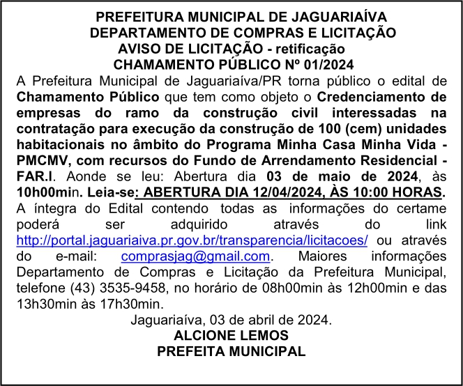 Aviso de Retificação do Chamamento Público Nº 01/2024