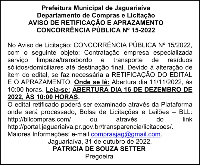 Aviso de Retificação e Aprazamento da Concorrência Pública Nº 15/2022