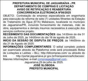 Aviso de Retificação e Reabertura de Concorrência Eletrônica N° 06/2025