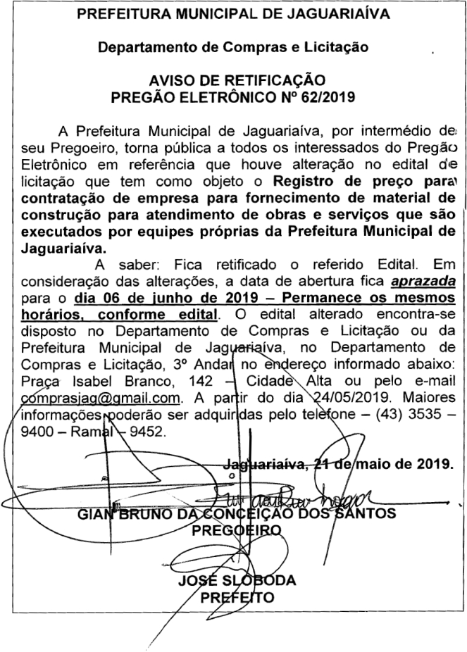 Aviso de Retificação Pregão Eletrônico Nº 62/2019