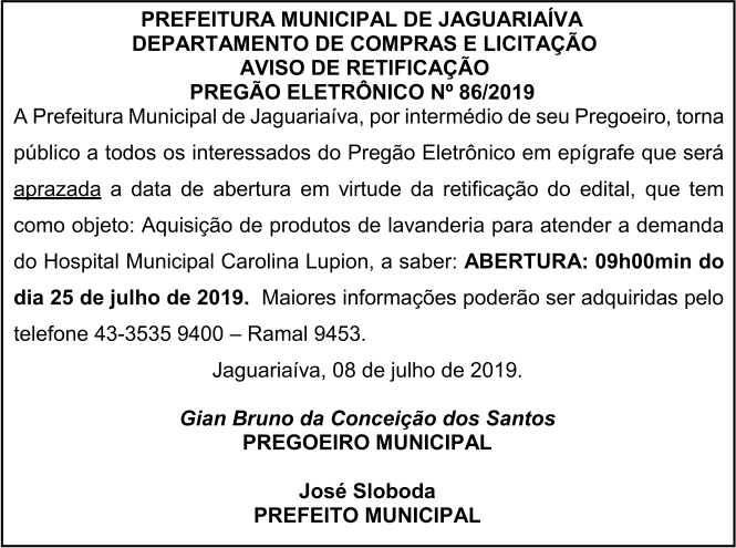 Aviso de Retificação Pregão Eletrônico Nº 86/2019