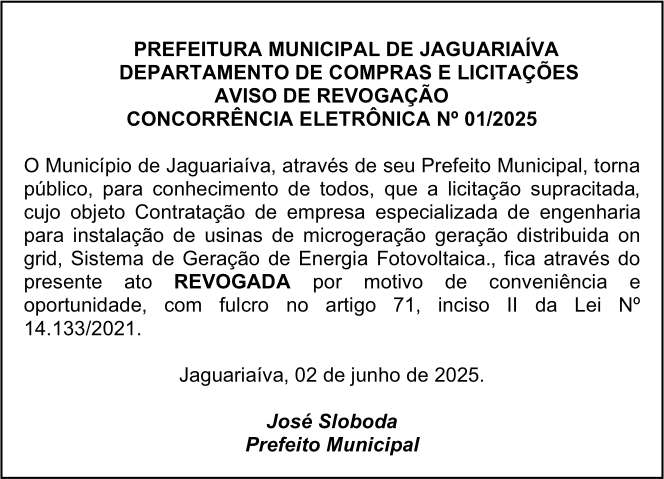 Aviso de Revogação de Concorrência Eletrônica Nº 01/2025