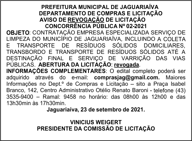 Aviso de Revogação de Licitação Concorrência Pública Nº 02/2021