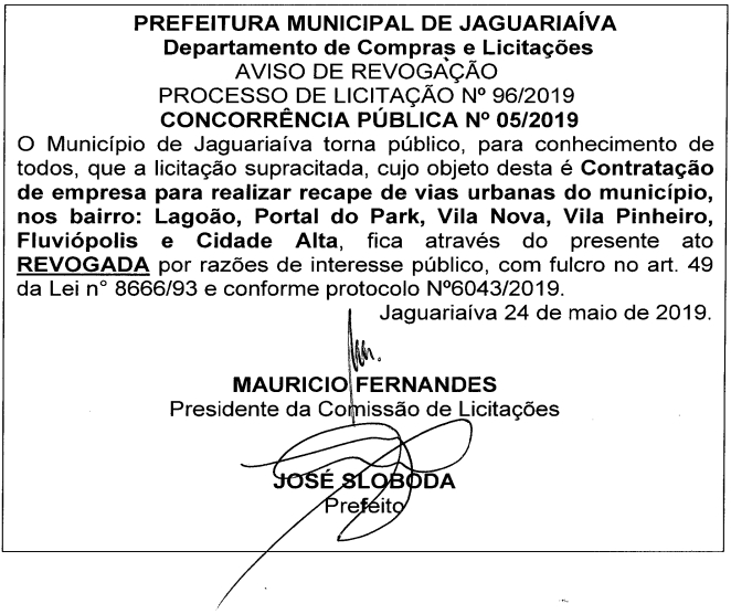 Aviso de Revogação de Licitação Concorrência Pública Nº 05/2019
