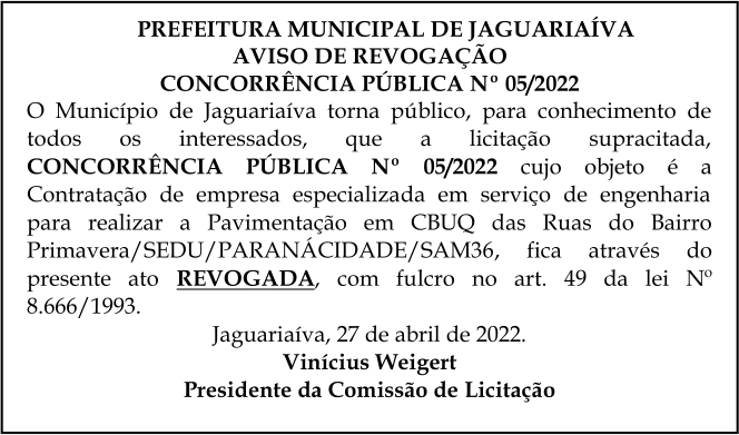 Aviso de Revogação de Licitação Concorrência Pública Nº 05/2022