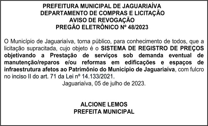 Aviso de Revogação de Licitação Pregão Eletrônico Nº 48/2022
