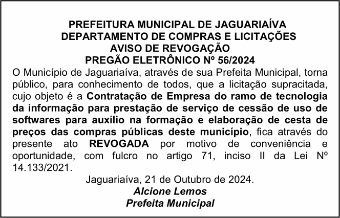 Aviso de Revogação de Licitação Pregão Eletrônico Nº 56/2024