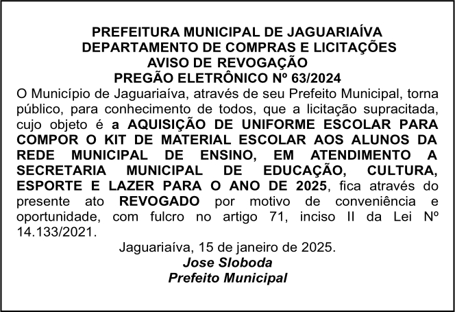 Aviso de Revogação de Licitação Pregão Eletrônico Nº 63/2024