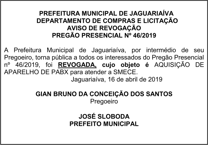 Aviso de Revogação de Licitação Pregão Presencial Nº 46/2019