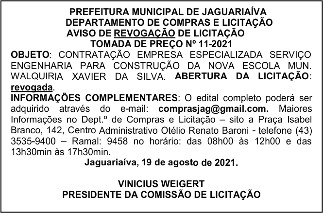 Aviso de Revogação de Licitação Tomada de Preço Nº 11/2021