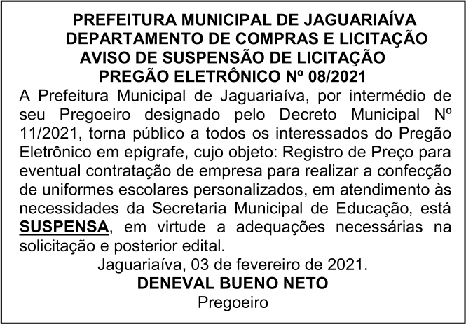 Aviso de Suspensão de Licitação Pregão Eletrônico Nº 08/2021