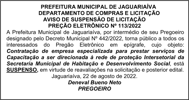 Aviso de Suspensão de Licitação Pregão Eletrônico Nº 113/2022