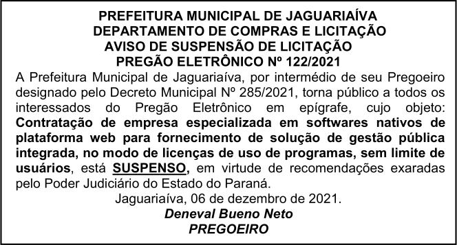 Aviso de Suspensão de Licitação Pregão Eletrônico Nº 122/2021