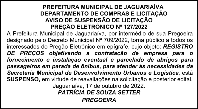 Aviso de Suspensão de Licitação Pregão Eletrônico Nº 127/2022