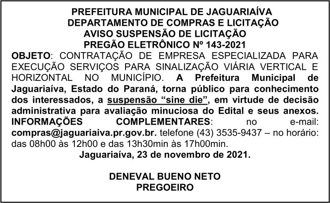 Aviso de Suspensão de Licitação Pregão Eletrônico Nº 143/2021