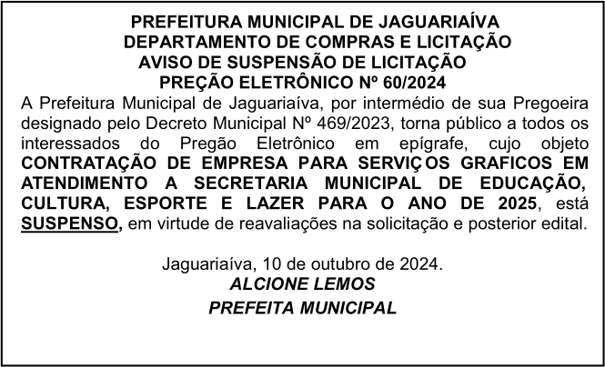 Aviso de Suspensão de Licitação Pregão Eletrônico Nº 60/2024
