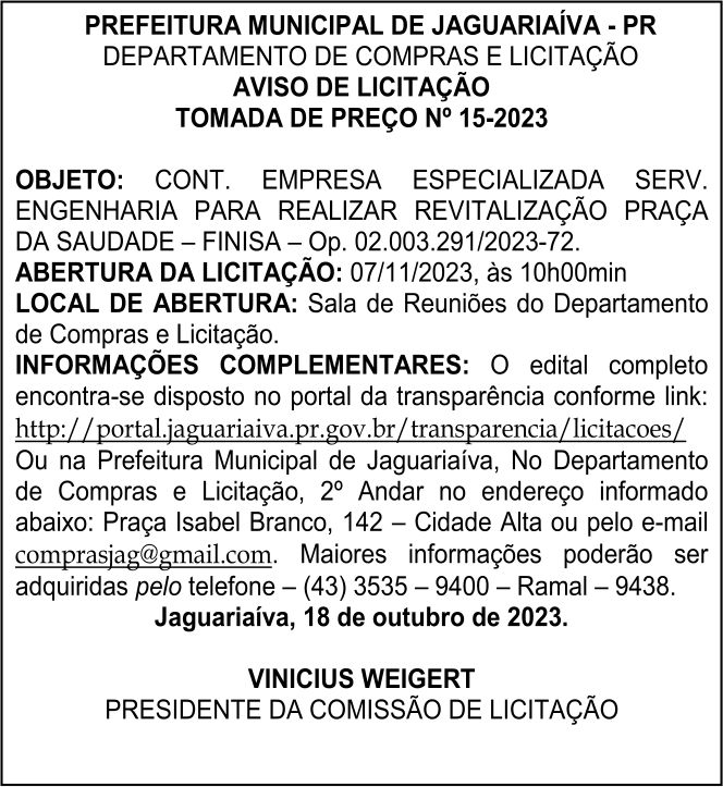 Aviso de Tomada de Preço Nº15