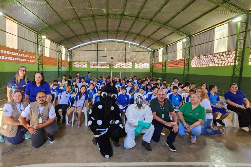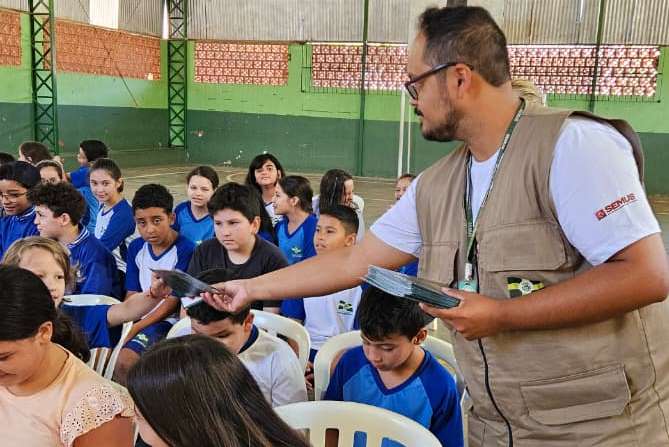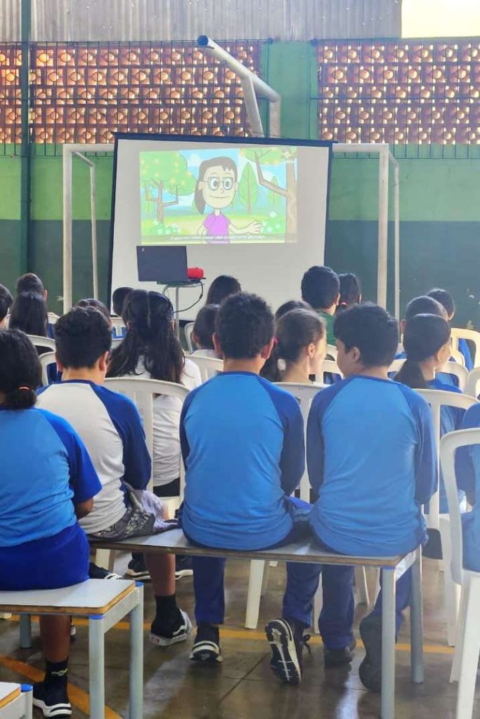 De maneira lúdica e interativa, profissionais da equipe de endemias (Vigilância em Saúde), junto com professores, mostram aos alunos como atitudes simples no dia a dia ajudam a proteger toda a comunidade.