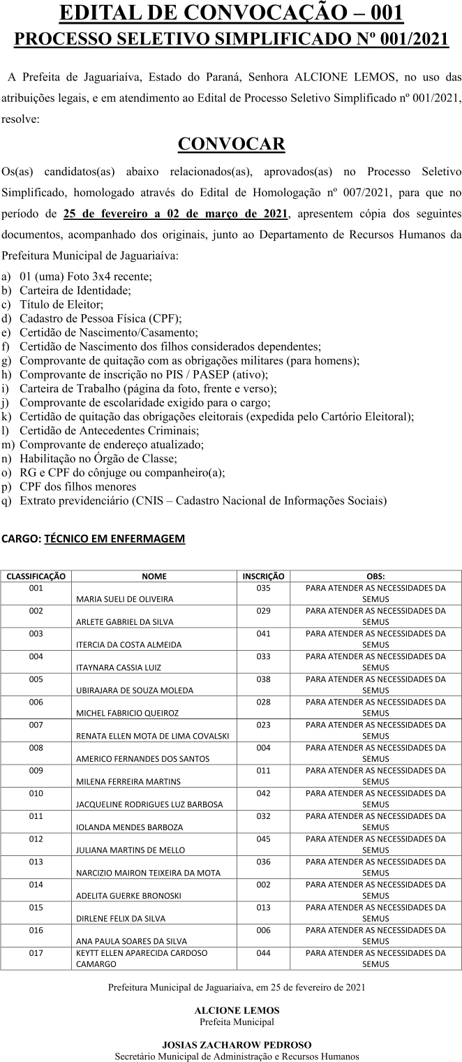 Edital de Convocação 001 – Processo Seletivo Simplificado 001/2021