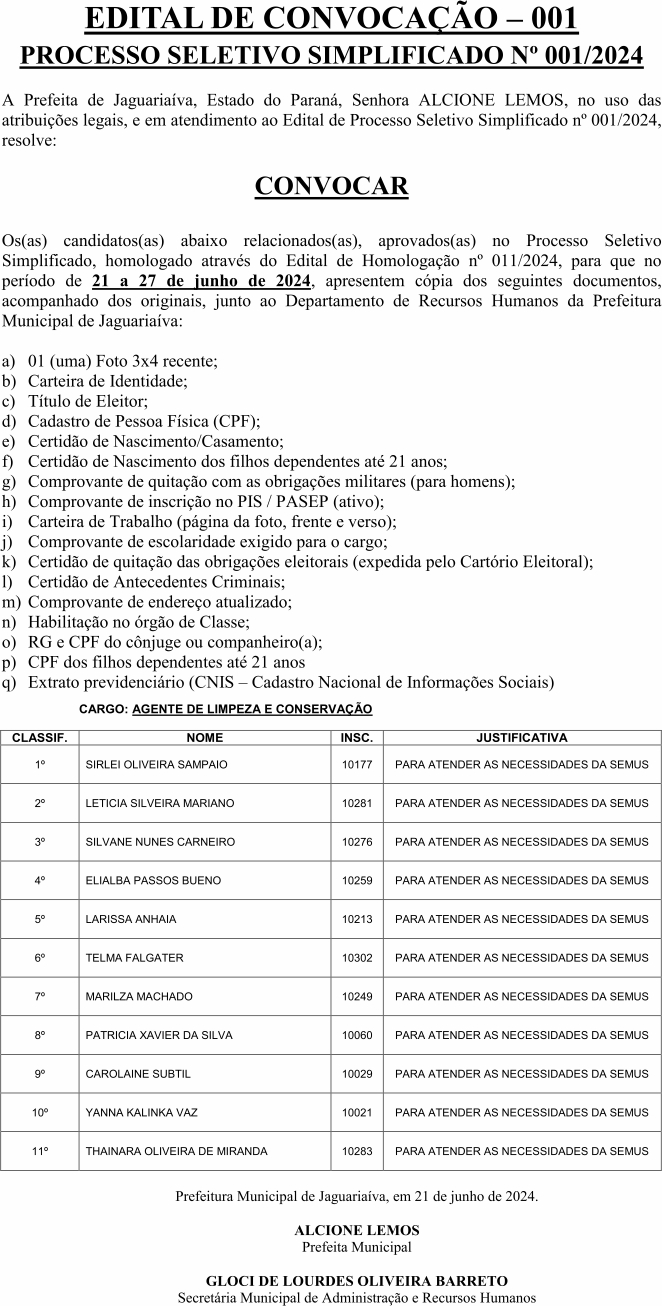 Edital de Convocação 001 – Processo Seletivo Simplificado 001/2024